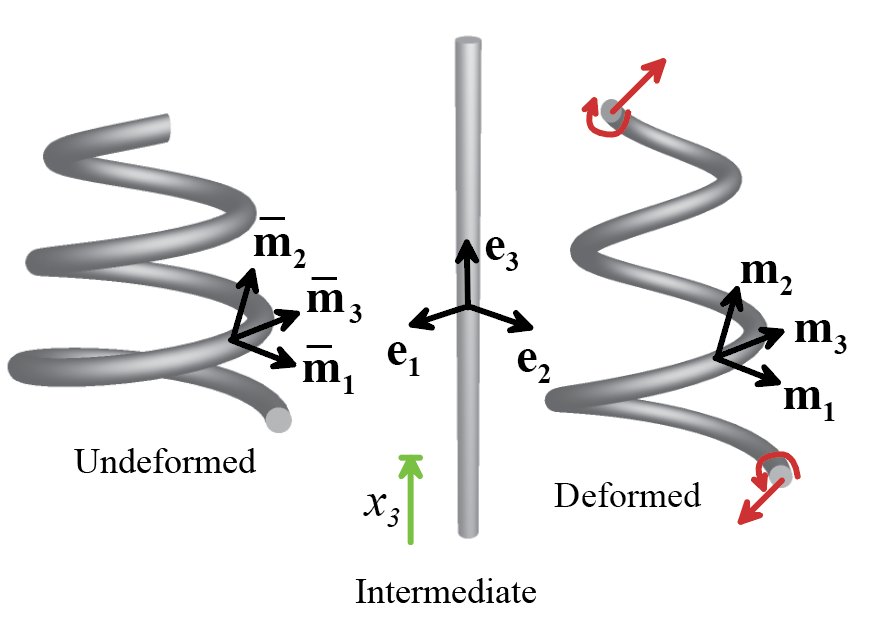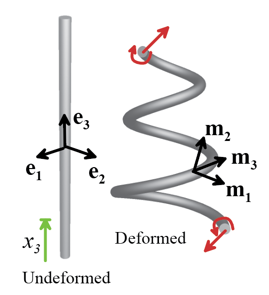 perpendicular unit vectors , chosen so that is parallel to the axis of the deformed rod,
