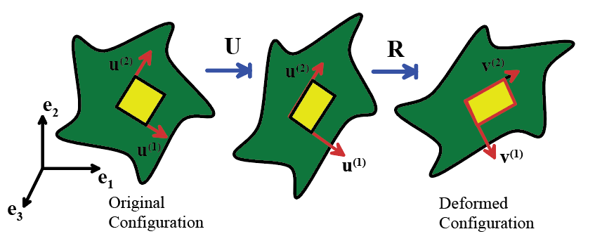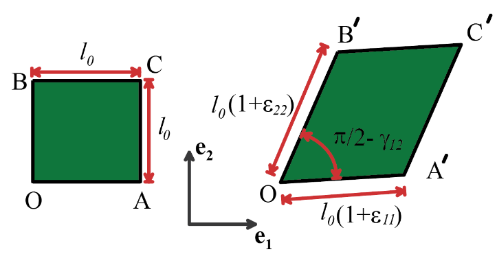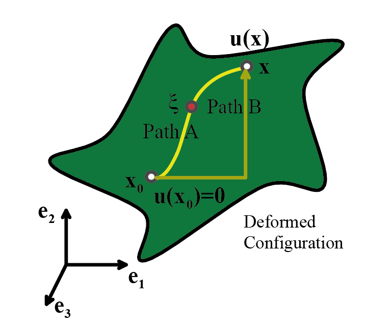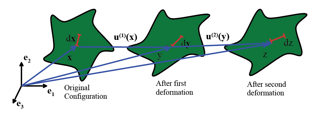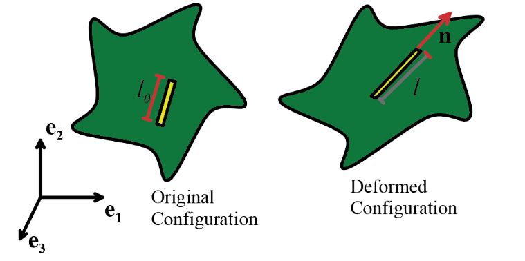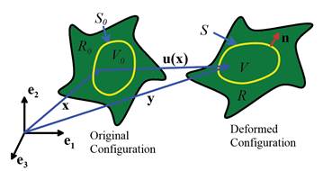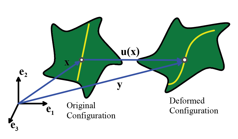deforming under external loads, as shown in the figure. Every point in the solid moves as the load is