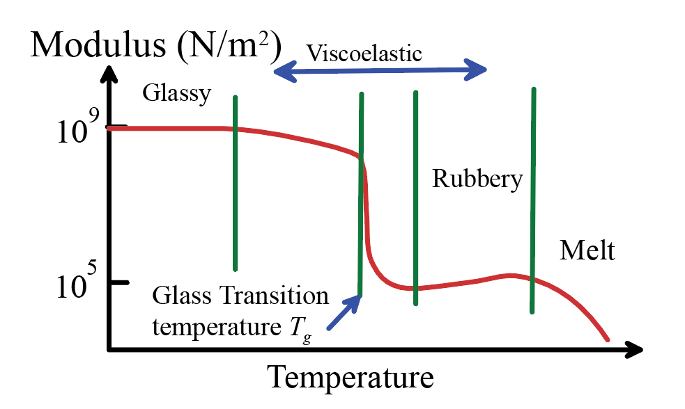 behavior, referred to as ‘glassy,’ ‘viscoelastic’ and ‘rubbery.’   The various regimes can be identified for a