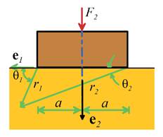 The figure shows a line load with force per unit out of plane distance acting at the origin of a large (infinite)