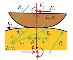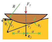 The figure shows two elastic cylinders with elastic constants , radii , and infinite length perpendicular to the plane